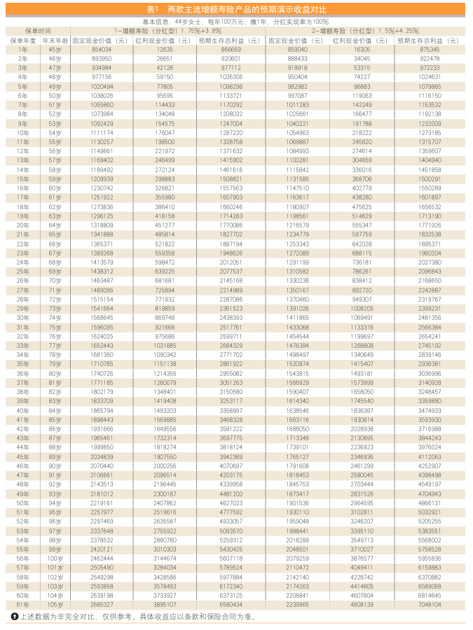 底下,仍以上述例子来阐发:44岁女性,一次性参预100万元,两款主流增额寿险居品对比(数据为预期演示收益,分成省略情)。具体的预期演示收益情况如表1所示。