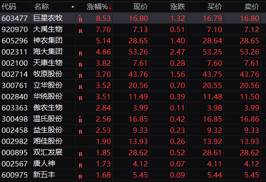 A股市集成见板块方面,猪肉成见股上昼走强,龙头股牧原股份盘中涨幅进步5%,温氏股份盘中涨幅一度接近5%,另外,巨星农牧盘中涉及涨停,神农集团盘中涨幅进步7%。