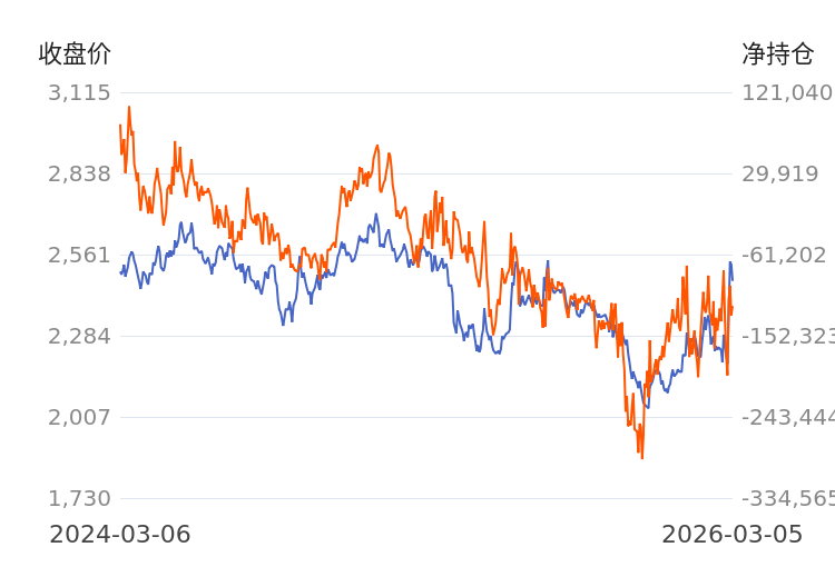 据统计,近两年价钱和净合手仓数据的关系扫数为0.86,两者存在高度正关系关系(同向性)。