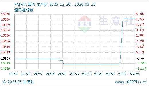 据贸易社监测,PMMA03月20日最新价钱15866.67元/吨,最近10天高涨3.25%,20天高涨5.54%。