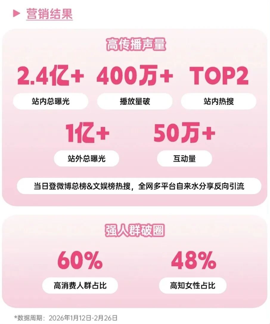 毛戈平则在践诺居品层面选择高端线护肤套装,匹配25岁以上高线城市高净值立正男性,投放以高播放量、高互动量的分区践诺为主。2月8日至14日,CPM<10,星火新客率超55%,星火ROI超10。