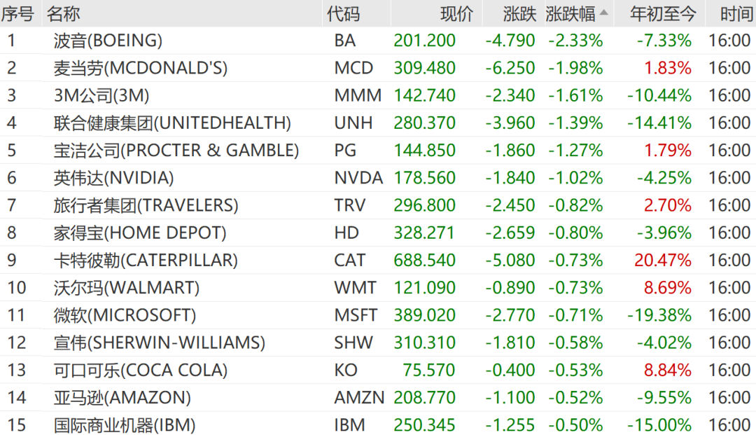 波音跌2.33%,麦当劳跌1.98%,3M公司跌1.61%,领跌谈指成份股。